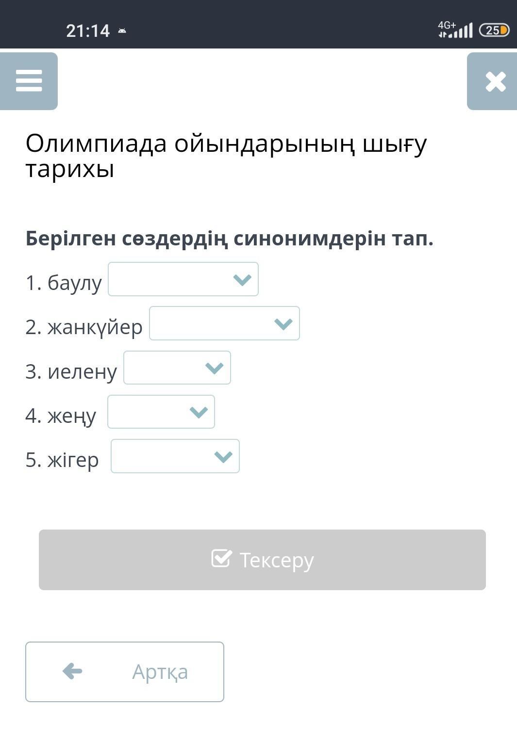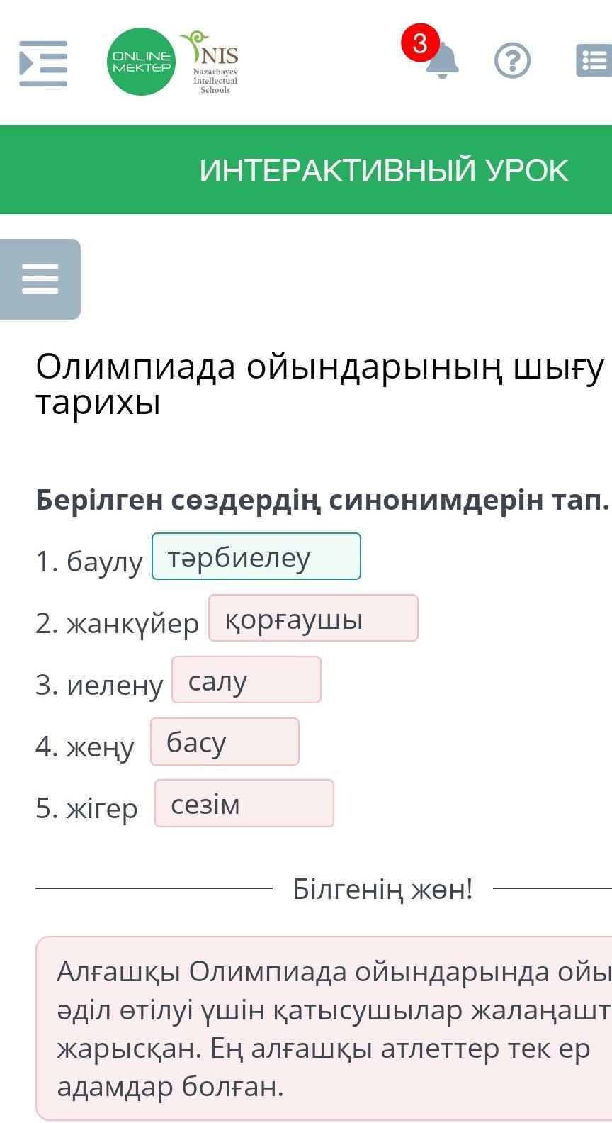 Олимпиада ойындарының шығу тарихы Берілген сөздердің синонимдерін тап. 1. баулу 2. жанкүйер 3. иелену 4. жеңу 5. жігер