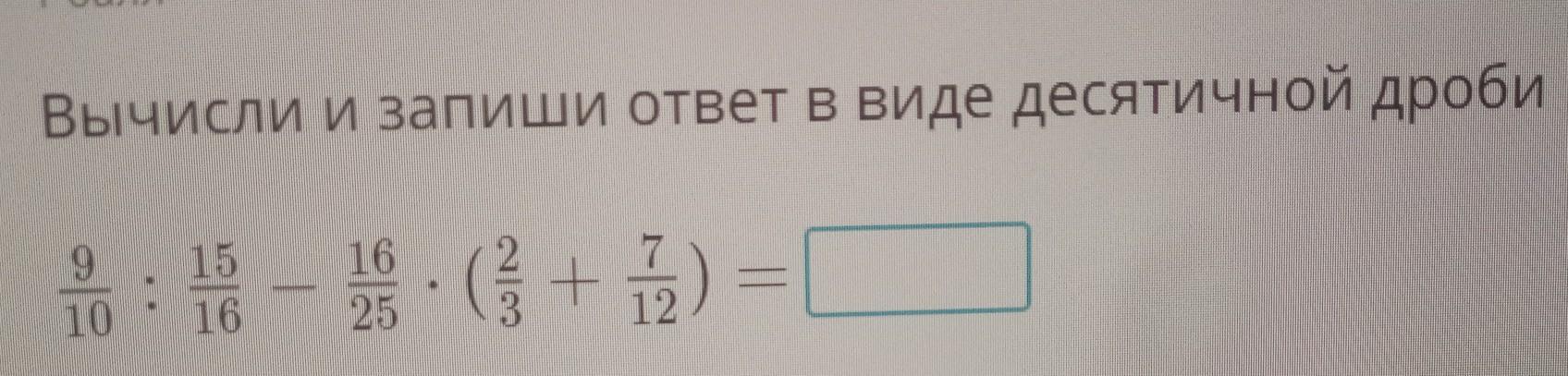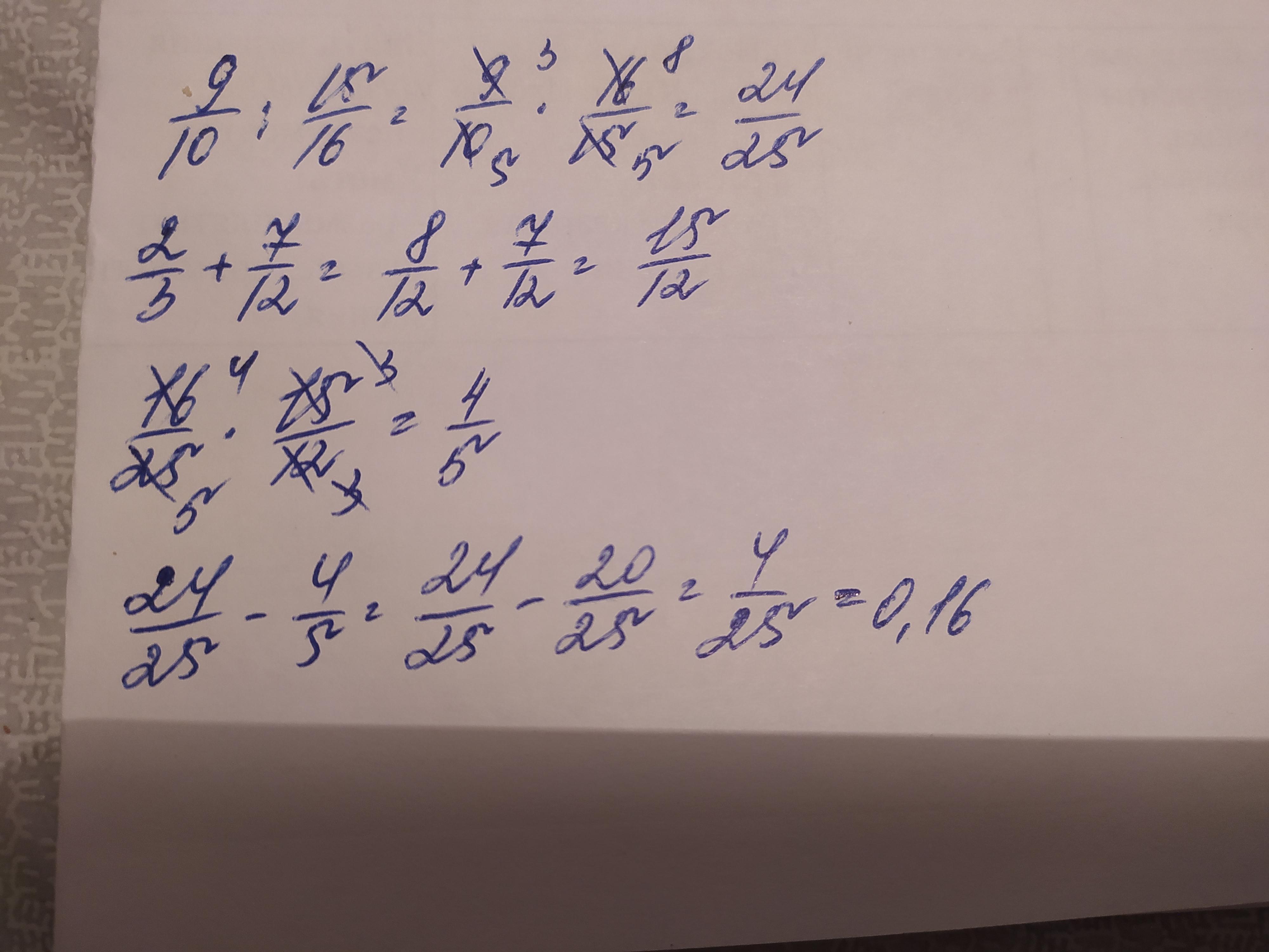 9/10 ÷ 15/16 × (2/3 +7/12)= 72/75 - 16/25 × ( 15/12) = 72/75 - 12/15 = 12/75 =4/25