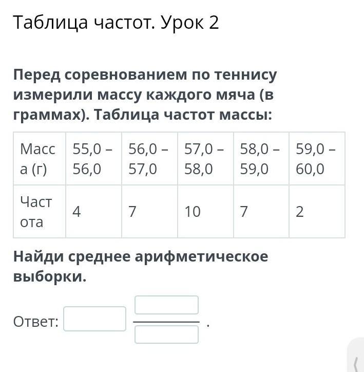 Перед соревнованием по теннису измерили массу каждого мяча (в граммах). Таблица частот массы: Масса (г) 55,0 – 56,0 56,0 – 57,0 57,0 – 58,0 58,0 – 59,0 59,0 – 60,0 Частота 4 7 10 7 2 Найди среднее арифметическое выборки.