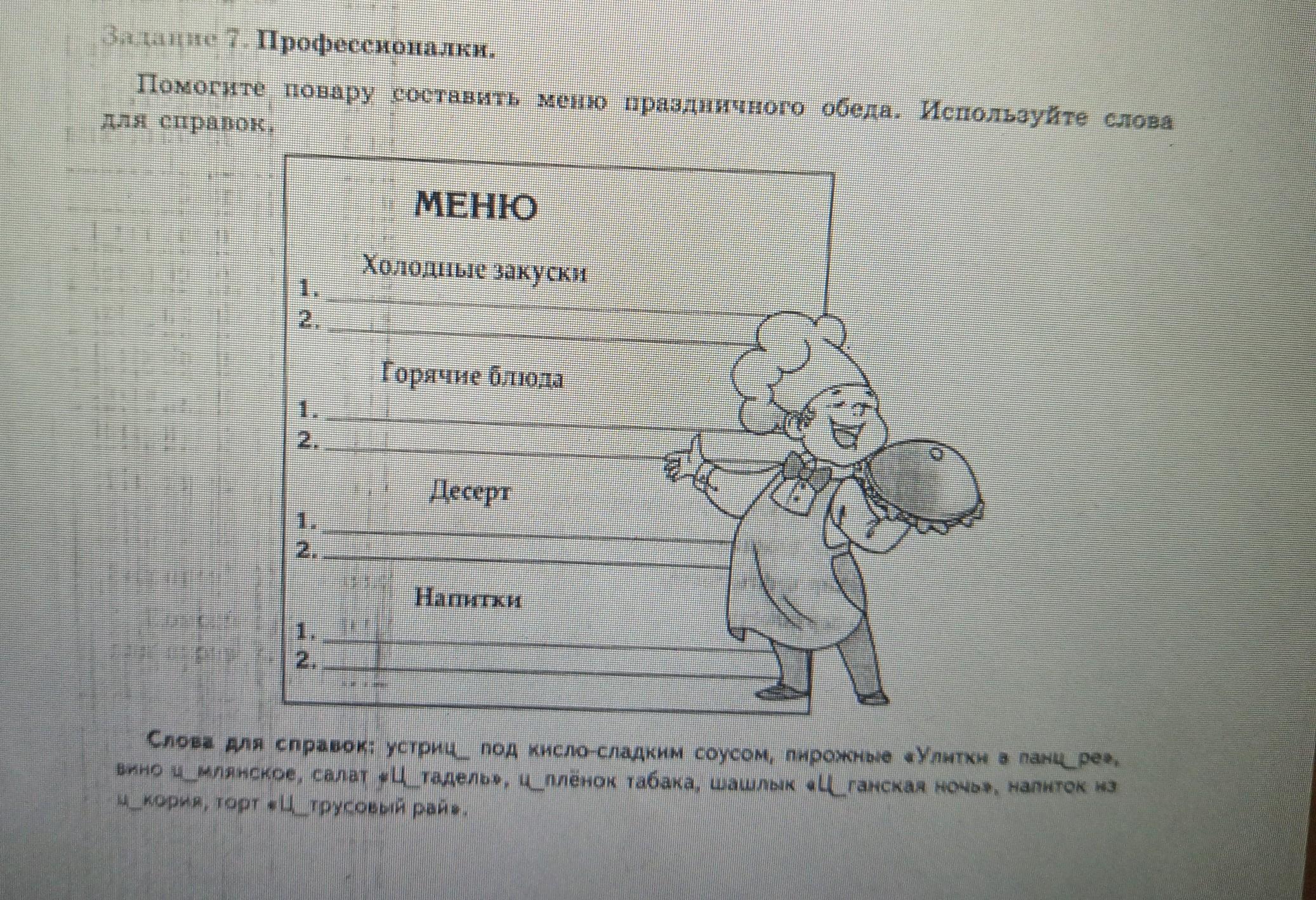 Устрицы под кисло-сладким соусом,пироженые „улитки в панцире”,вино цимлянское, салат „цитадель”,цыплёнок табака, шашлык „цыганская ночь”,напиток из цикория, торт „цитрусовый рай”.