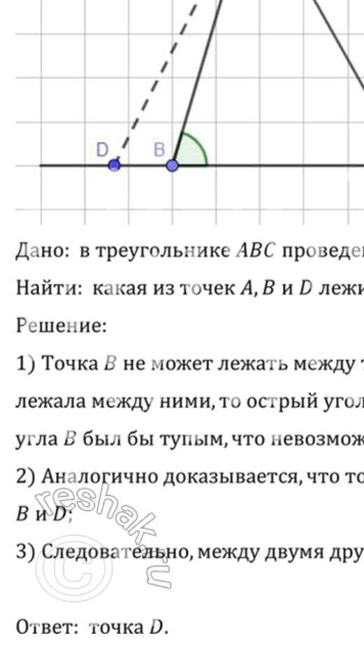 1) Точка B не может лежать между точками A и D, так как если бы она лежала между ними, то острый угол CBD как внешний угол острого угла B был бы тупым, что невозможно, так как угол CBD=90°;