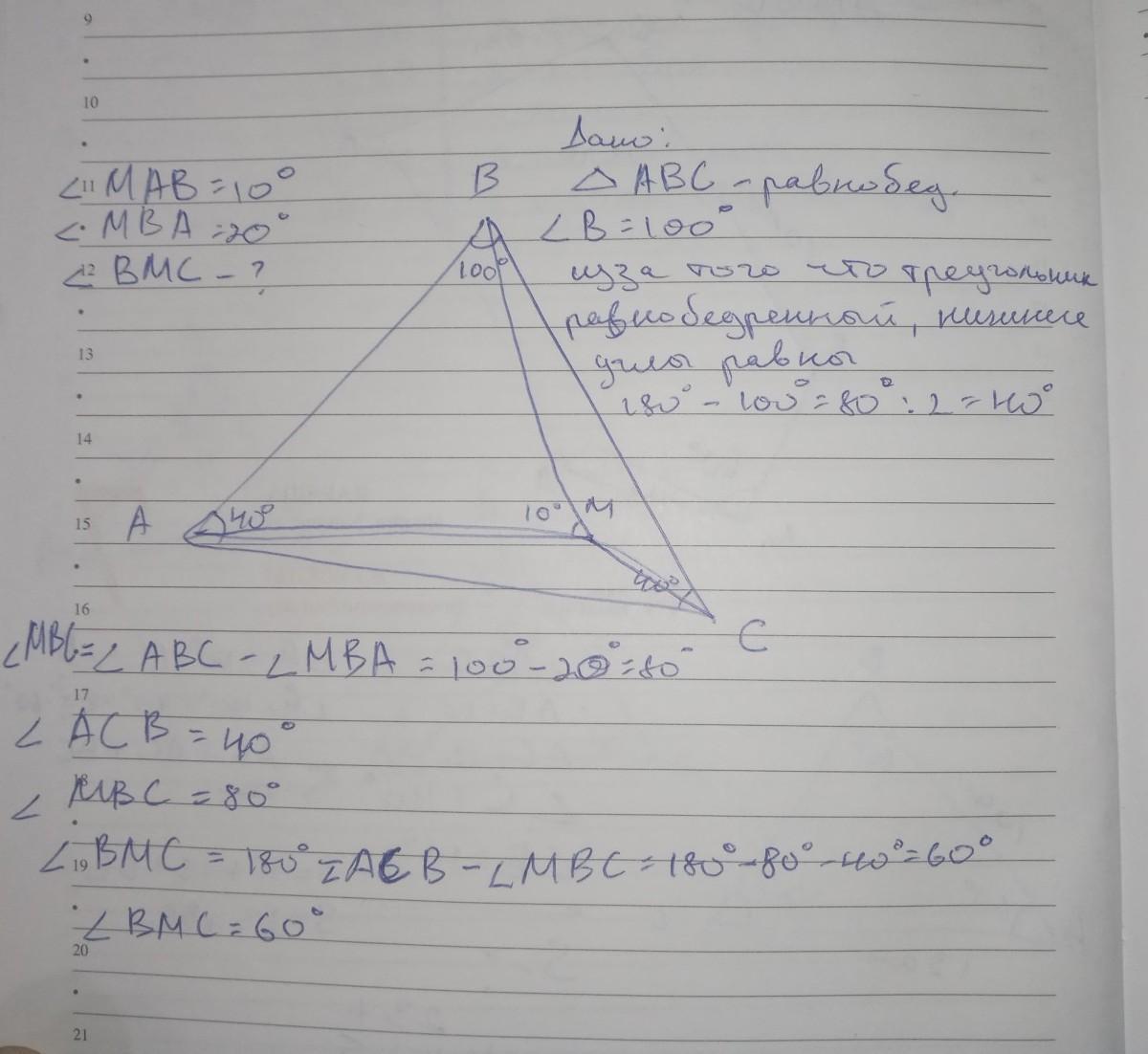 СРОЧНО!!!!!!ДАЮ 20 БАЛЛОВ! треугольник ABC равнобедренный угол b=100° Внутри треугольника взяли и поставили точку M угол MAB=10°,угол MBA=20°,угол BMC-?Можно с рисунком пожалуйста,спасибо.