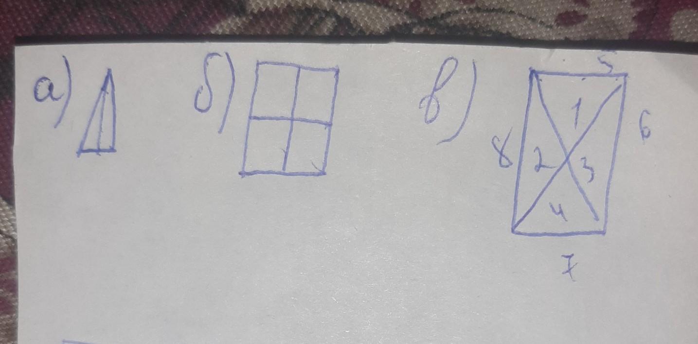 в) Постройте прямоугольник. Проведите две прямые линии, чтобы получить 8 треугольников