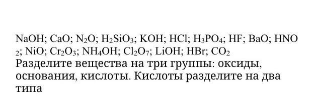 NaOH; CaO; N2O; H2SiO3; KOH; HCl; H3PO4; HF; BaO; HNO 2; NiO; Cr2O3; NH4OH; Cl2O7; LiOH; HBr; CO2 Разделите вещества на три группы: оксиды, основания, кислоты. Кислоты разделите на два типа