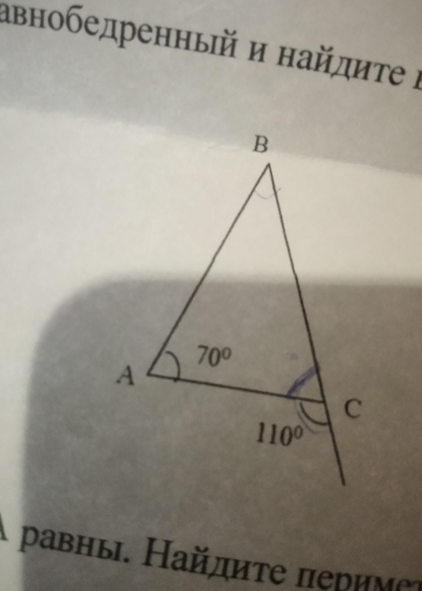 равнобедренный, т.к. АС+АСВ равно 180°, т.к. это развёрнутый угол, значит мы модем найти угол АСВ (180-110) =70°, получается, что ВАС и АСВ равны, если так, то треугольник АВС равнобедренный (если два угла равны, то треугольник равнобедренный)