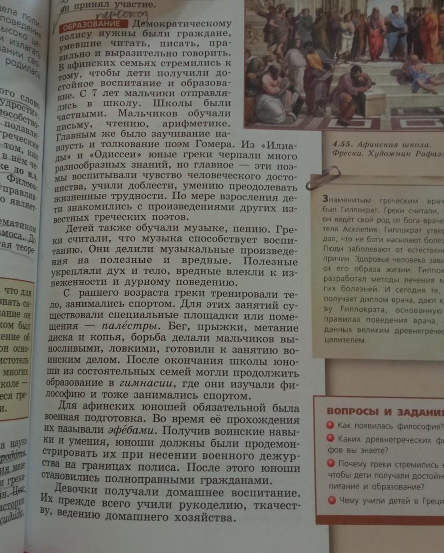 демократичесеому полису нужны были обученные граждане. С 7 лет мальчики отправлялись в школу там их обучали письму и арифметике.Главным же было заучивание наизусть толкование поэм Гомера из "Иллады" "Одессеи". Детей так же обучали музыке, т.к. греки считали что музыка способствует воспитанию. С Раннего возраста греки тренировали тело, занимались спортом. Для этих занятий существовали палестры. После окончания школы юноши могли пойти в гимнасии.Для афинских юношей было не менее важна военная подготовка. Девочек прежде всего учили рукоделию.