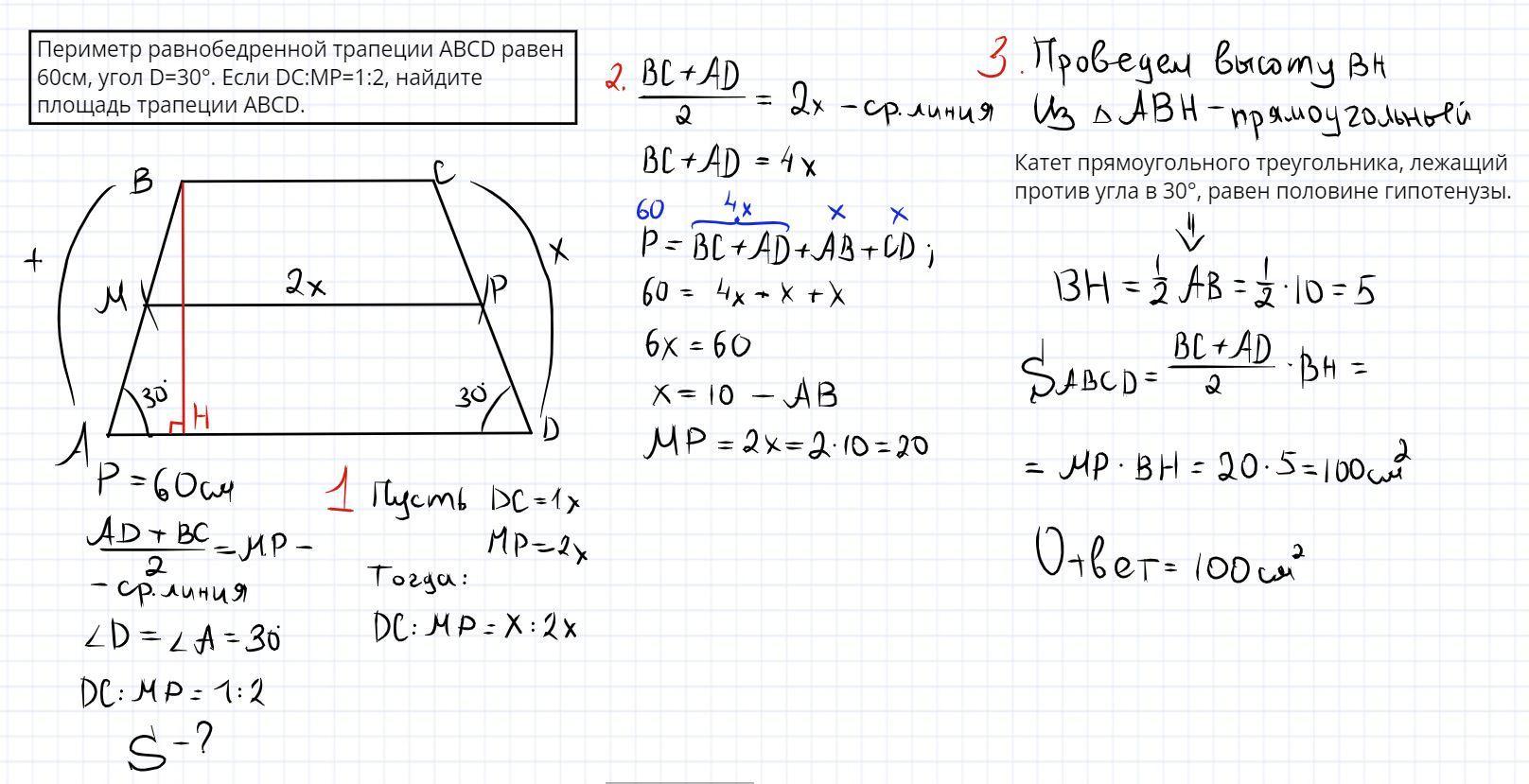 Периметр равнобедренной трапеции ABCD равен 60см, угол D=30°. Если DC:MP=1:2, найдите площадь трапеции ABCD.
