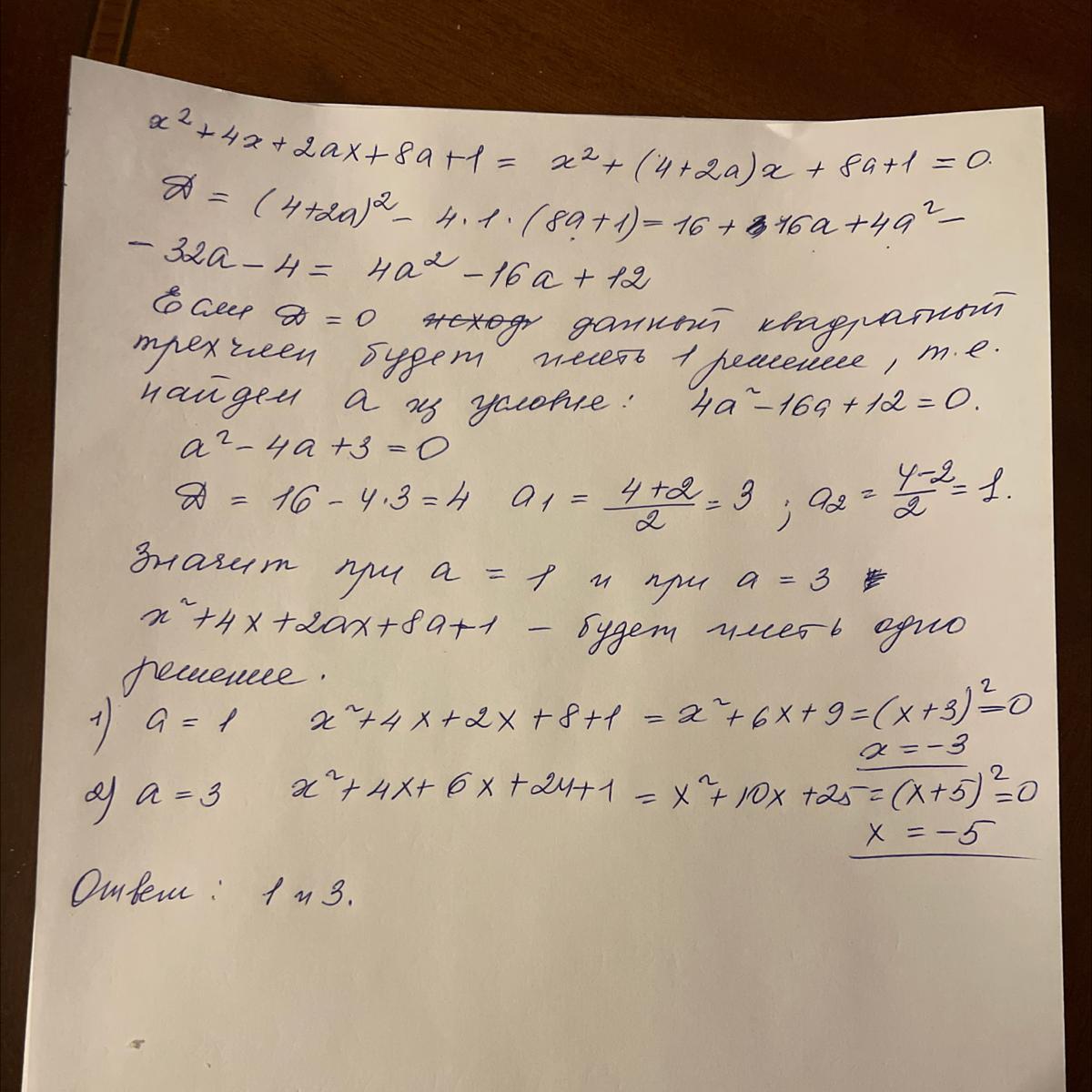 Найдите значения параметра a, при каждом из которых квадратный трехчлен x²+4x+2ax+8a+1 имеет одно решение. Ребята, ПОЖАЛУЙСТА!!!!!