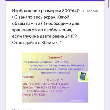 Изображение размером 800*640 (К) заняло весь экран. Какой объем памяти (I) необходимо для хранения этого изображения, если глубина цвета равна 24 (i)? Ответ дайте в Кбайтах. *