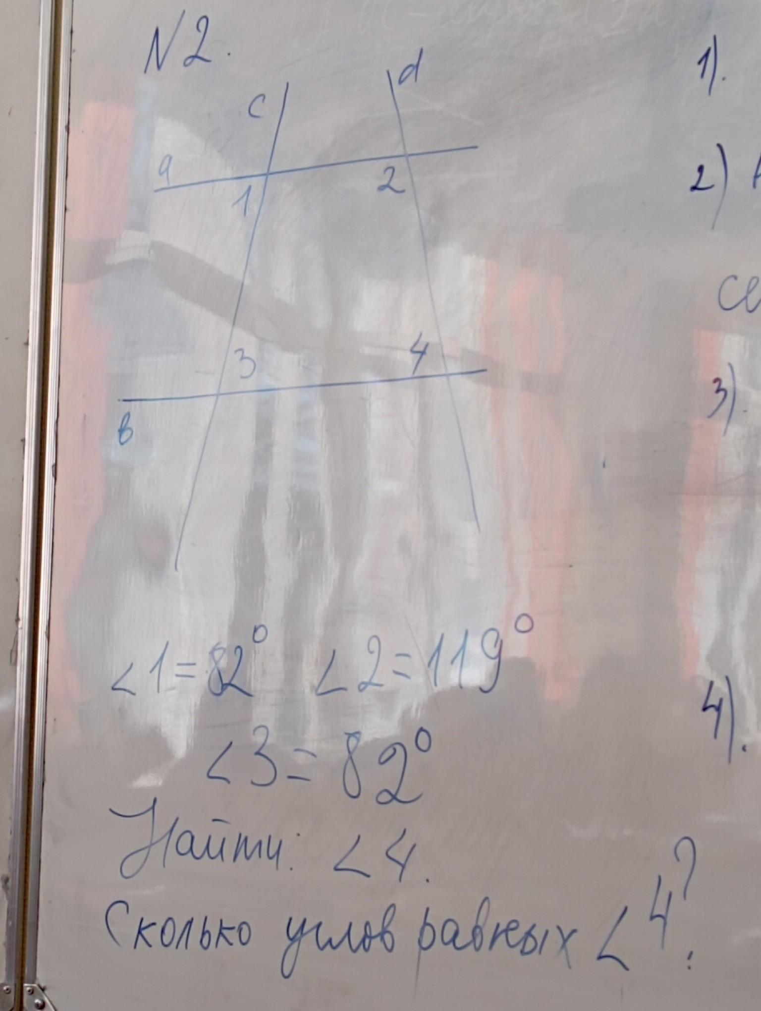 Один вертикальный с углом 4, второй смежный с углом 2, третий вертикальный с углом, который смежный с углом два.