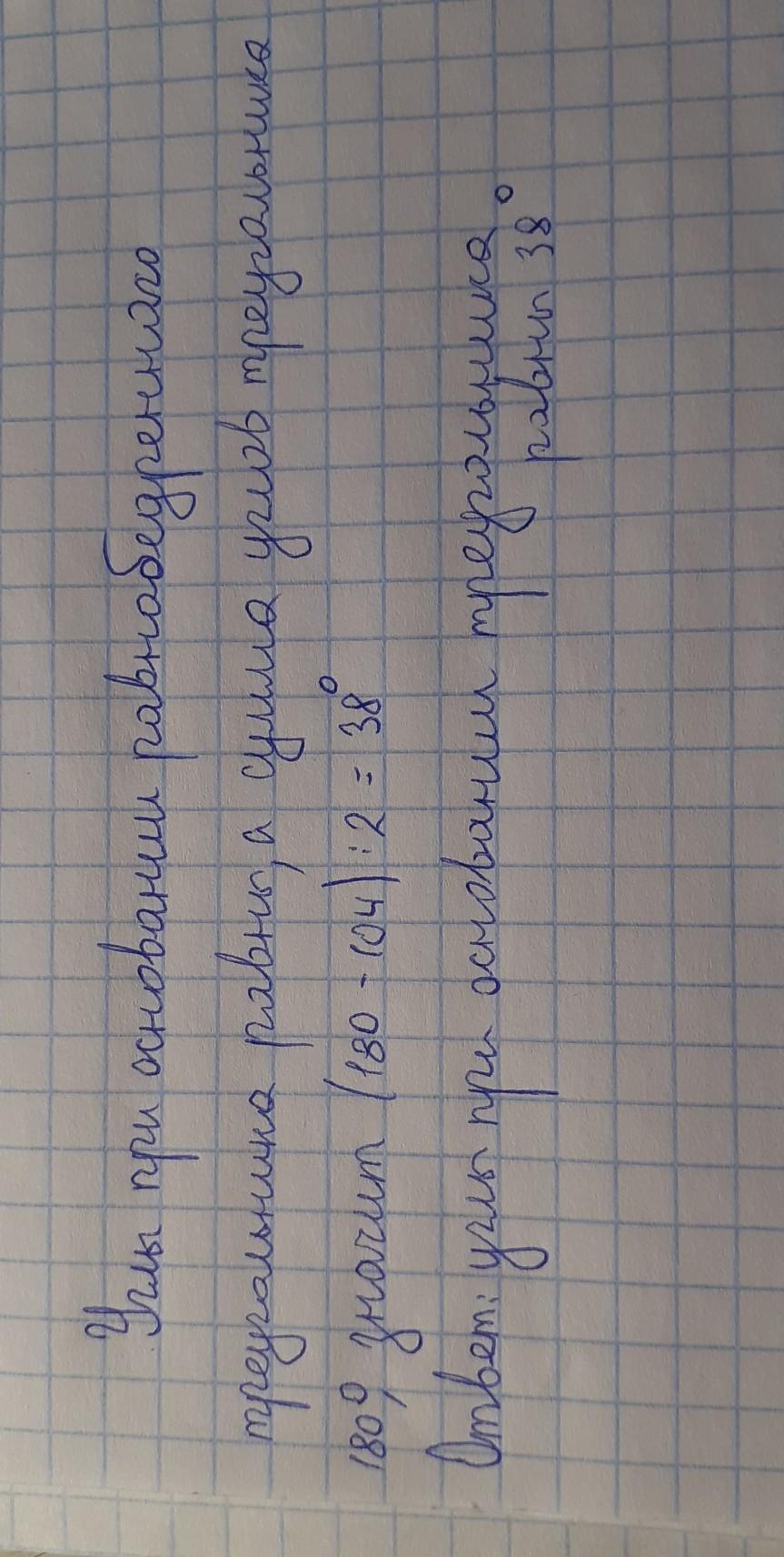 Угол при вершине равнобедренного треугольника равен 104°.Найдите углы при основании этого треугольника.