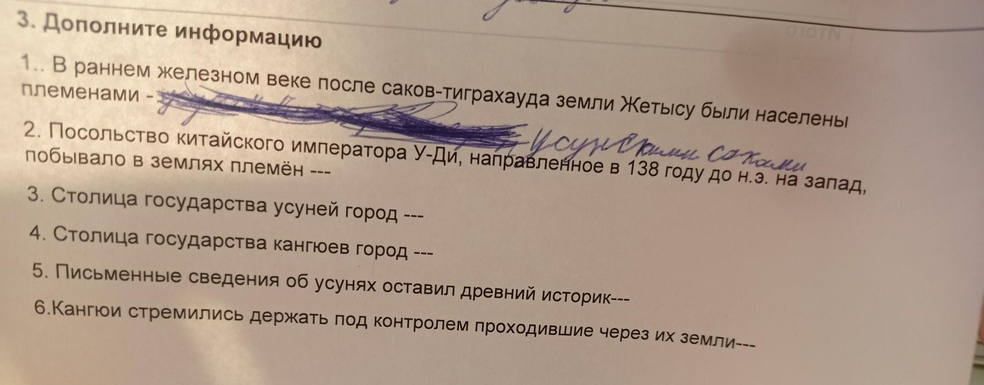 3. Дополните информацию 1. В раннем железном веке после самое трана на земни Жетысу были населен nеменами удаа 2. Посольство китайского императора Улаа побывало в землях племена ardiannesee a 13 году до ня на запад 3 Столица государства усуней город 4 столица государства кагоев горо 6. Письменные сведения об усуняк оставил Арсений историко- 6 Кангюй стремились держать под контролем проходили через их земли БЫСТРЕЕЕЕ ЭТО СОР