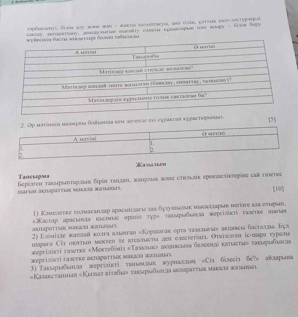 әрқайсысы 16 әлемнен Оқылым Тапсырма 1. Мәтіндерді оқып, олардың тақырыбын, мәтіндердің типтерін, құрылымын салыстырыңыз. Мәтіндер қандай стильде жазылған? [5] Амәтіні Құқықбұзушылық әрекеттерге қандай бала барады? Шаңырақ көтеріп, баланың бал кызығымен отбасылық өмірді енді ғана бастап келе жатқан отбысының екіге айырылысуы бала психикасына кері әсері мол. Баланың ішкі әлемінде сыртқа айта алмайтын сырларының жиналуы да, теріс кылыктарға жол беретіні тағы бар. Екі жақты мейірім көрмеген бала мейірімге мұқтаждық тауқыметін бастан кешіп, сыртқы мейірім іздейді. Отбасы бүтін бола тұра әлеуметтік жағдайының төмендігінен де жаман әрекеттерге баратындары да жоқ емес. Ата-анасынан қысым көрген балалар да теріс әрекеттерге бой алдыруда. Мысалы; ата-анасының тапсырмасын орындамау салдарынан (үй жұмысы, мөлшерден артық қаржы, ой санаспау т.с.с) қысым көргендер де. Психолог және психиатр мамандар адамның жан дүниесін 100 пайыз зерттей алмайды. Адам баласының миында түсініп болмайтын жайттар болып жатады. ГЕН мәселесі де үлкен рол ойнайды. Ұлжанның ақ сүтімен, Зеренің зерделі ертегілерімен сусындаған кешегі Абай — нар қазақ. Бүгінде кешегі Абайдай қазақты тәрбиелеуде әжелеріміз бен аналарымыздың алатын орны ерекше. Өмір бойы әкесінің жұмбағын шешуге бар күш жігерін сарп еткен Абайдай ұрпақты тәрбиелеу әрбір әкенің парызы деп білемін. Тәрбиесі тереңге жайылған толыққанды отбасынан азаматтардың шығатынына күмәнім жоқ! Ал тәрбие бар жерде құқықбұзушылыққа жол жоқ. «Қатты тәртiр көрсе бала күнінде, өнерімен қуантады түбінде!» деген Жүсіп Баласағұнның қанатты сөзі бала тәрбиесіне жастайынан мән беруді меңзеп, бала тәрбиесіне көп көңіл бөлуге шақырады. Тәртіпке бас иген елдің азаматтары ғана Жаңа әлемдегі жаңа Қазақстанды жасай алады! Өйткені кемелденген мемлекет кемелді жастардың қолында! Эмәтіні ЗИЯЛЫ - Азаматтың міндеті – заң талаптарын бұзбау, екінші жағынан өзіне жүктелген міндетін орындау. Заңның мықтылығы атында емес, адалдығы мен әділдігінде. Заңның ең басты Eқсаттарының бірі қоғамдағы алуан мінезді адамдарды салауатты өмір салтына рбиелеу. Заңды білмеу – құқықтық мәдениеттің елеулі кемшілігі. Заңды білмеу, оны бұзу гапкершіліктен құтқармайды. Бұл жерде білімгер заң және құқықтық мәдениет ұғымын гастырмау керек. Құқықтық мәдениет білімгерлерден жан-жақты құқықтық білімдерді ап етеді. Мемлекеттің білімді, адамгершілікті, тапқыр, кез-келген жағдайда дербес шешім ай алатын, ынтымақтасуға және өзара іс-қимылға қабілетті, ел тағдыры үшін пкершілік сезіміне ие адам тәрбиелеу мәселесі жөніндегі әлеуметтік сұранысына жыл нғы Республика Президентінің Қазақстан халқына Жолдауы. Қазақстан Республикасы ттарын патриоттыққа тәрбиелеу Мемлекеттік бағдарламасынан және т.б. аса маңызды тардан орын алуда. Тәрбие үрдісіне тікелей қатысты негізгі құқықтар Қазақстан бликасының Конституциясында бекітілген. Қазақстан Республикасынын гуциясында (12, 27, 28, 29, 30, 36- баптарында), «Қазақстан Республикасындағы бала . ры туралы», «Білім туралы», «Діни сенім бостандығы және діни бірлестіктер туралы» acәне отбасы туралы», «Кәмелетке толмағандар арасындағы құқық бұзушылықтарды алу мен балалардың қадағалаусыз және панасыз қалуының алдын алу туралы үлгісіндегі балалар ауылы және жасөспірімдер үйлері туралы», «Азаматтарды Iғын сақтау тур