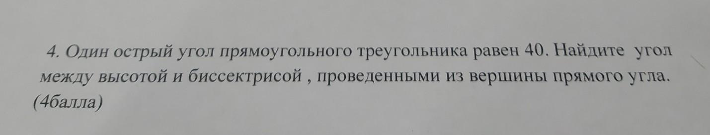 4. Один острый угол прямоугольного треугольника равен 40. Найдите угол между высотой и биссектрисой , проведенными из вершины прямого угла. (4балла)