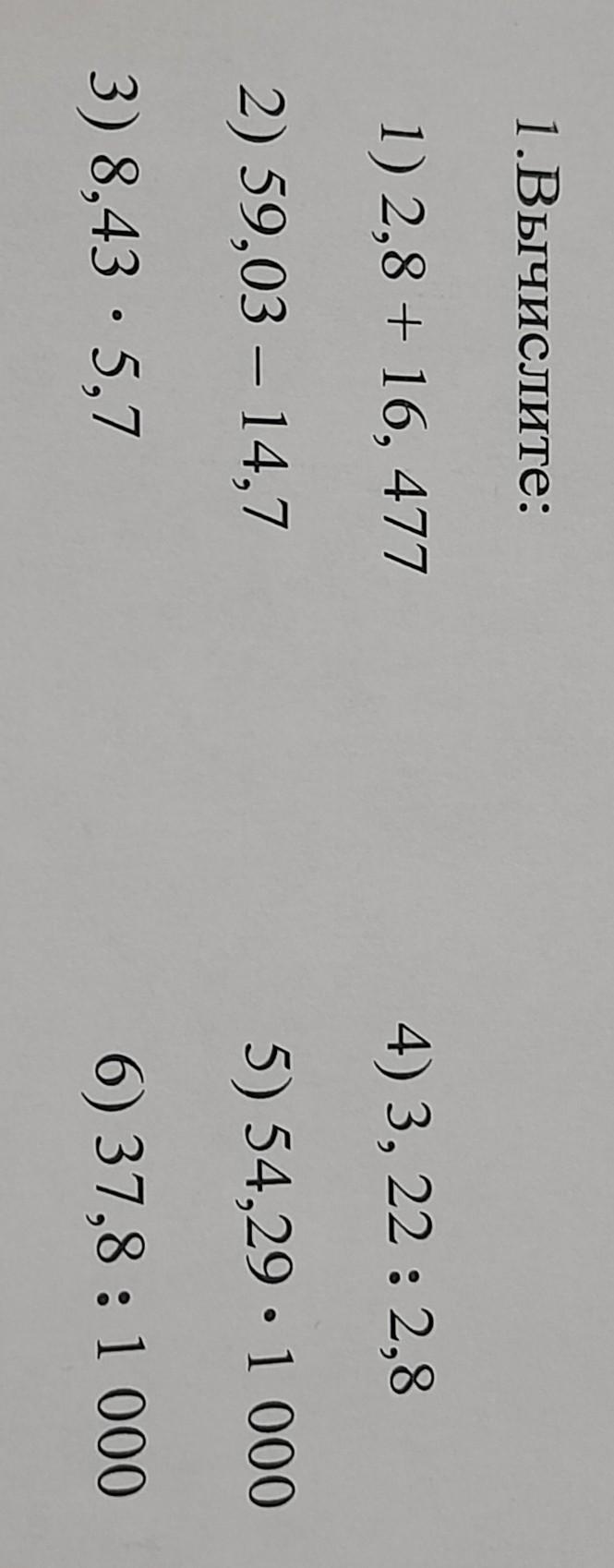1.Вычислите: 1) 2,8 + 16, 477 4) 3, 22 : 2,8 2) 59,03 - 14,7 - 5) 54,29. 1 000 3) 8,43 · 5,7 . 6) 37,8:1 000