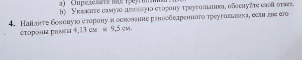 Найдите боковую сторону и основание равнобедренного треугольника, если две его стороны равны 4,13 см и 9,5 см.