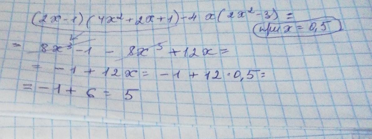 (2х-1)(4х^2+2х+1)-4х(2х^2-3) при х=0.5 равно 5
