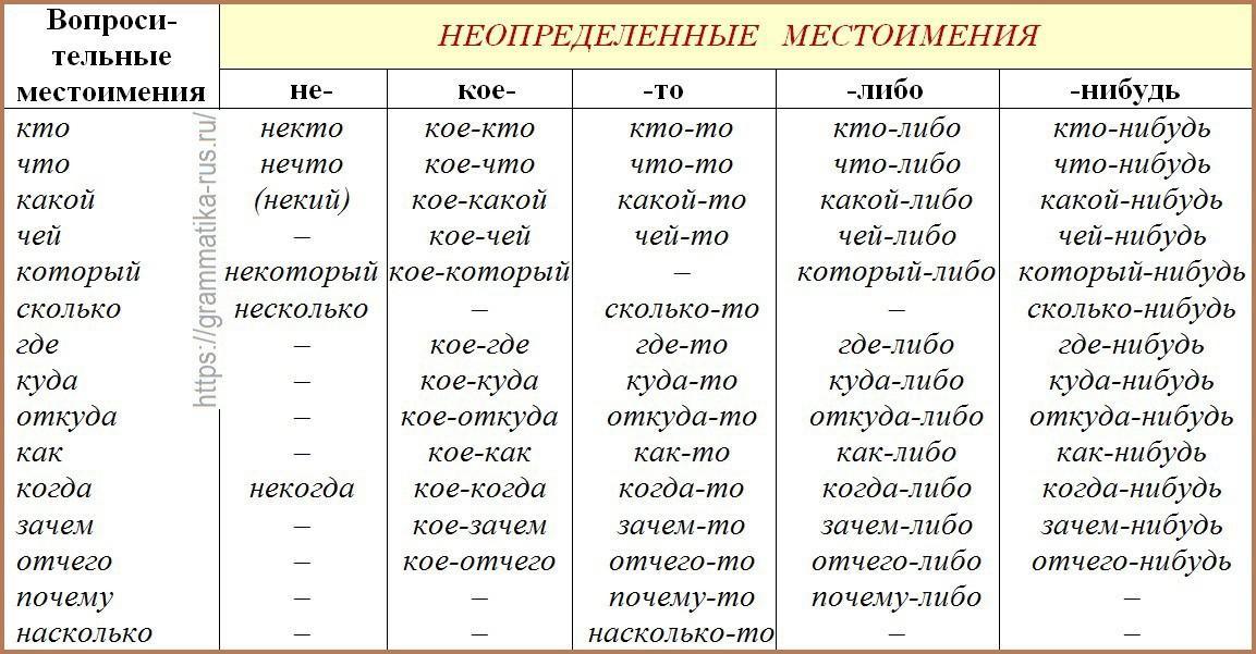 Неопределенные местоимения образуются от от вопросительных и относительных местоимений с помощью приставки не-, которая всегда является ударной, и частиц кое-, -то, -либо, -нибудь, которые с этими словами пишутся с дефисом.