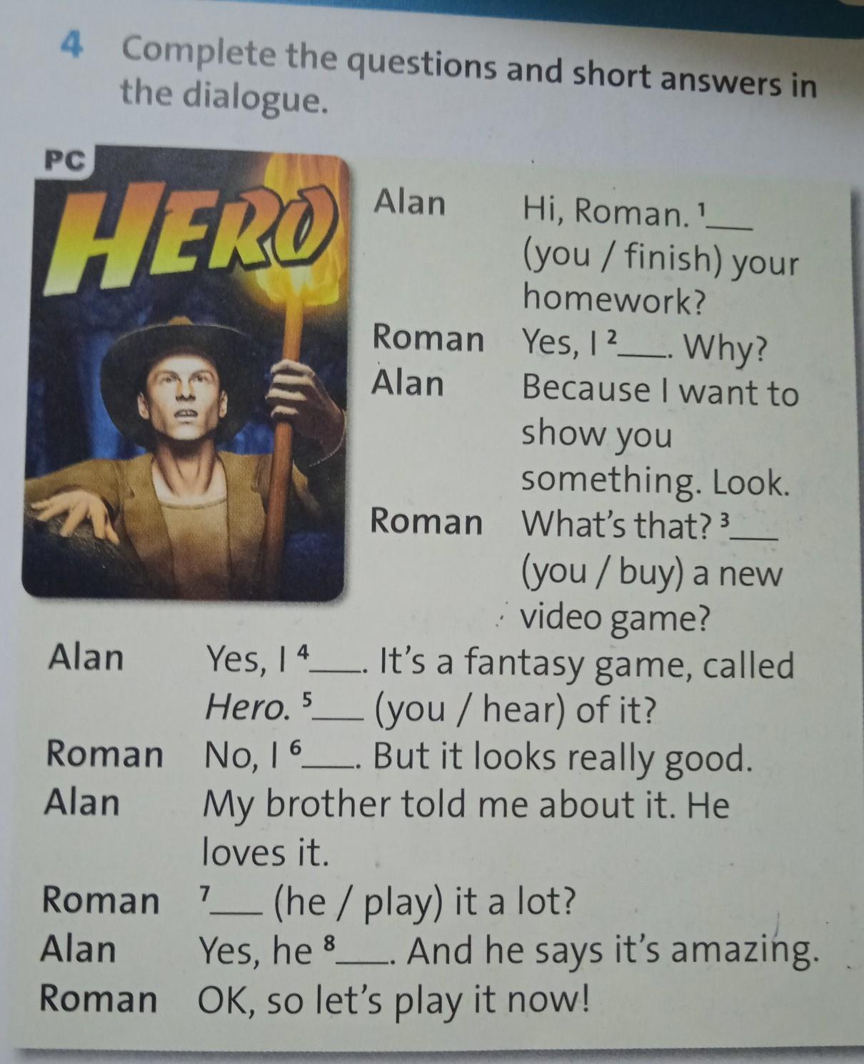 4 Complete the questions and short answers in the dialogue. PC HERO Alan Hi, Roman, (you / finish) your homework? Roman Yes, 1?___. Why? Alan Because I want to show you 5 Hero. 5 something. Look Roman What's that?? (you / buy) a new · video game? Alan Yes, 14 It's a fantasy game, called (you / hear) of it? Roman No, 16 But it looks really good. Alan My brother told me about it. He loves it. Roman ?_ (he / play) it a lot? Alan And he says it's amazing. Roman OK, so let's play it now! 8 Yes, he 8