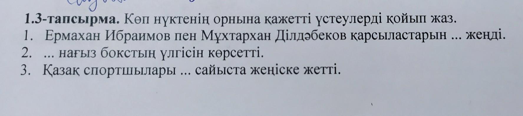 1.3-тапсырма. Көп нүктенің орнына қажетті үстеулерді қойып жаз. 1. Ермахан Ибраимов пен Мұхтархан Ділдәбеков қарсыластарын ... жеңді. 2. нағыз бокстың үлгісін көрсетті. 3. Қазақ спортшылары ... сайыста жеңіске жетті.
