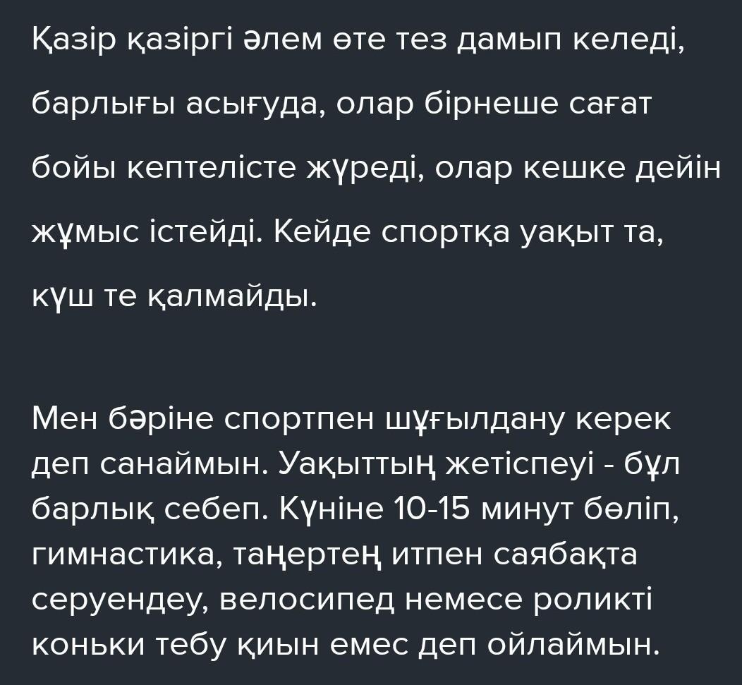 Спорт біздің өмірімізде үлкен рөл атқарады.Елімізде спортпен көп адамдар айналысады. Олар сау болғысы келеді. Спорт - стресспен күресудің жақсы тәсілі.