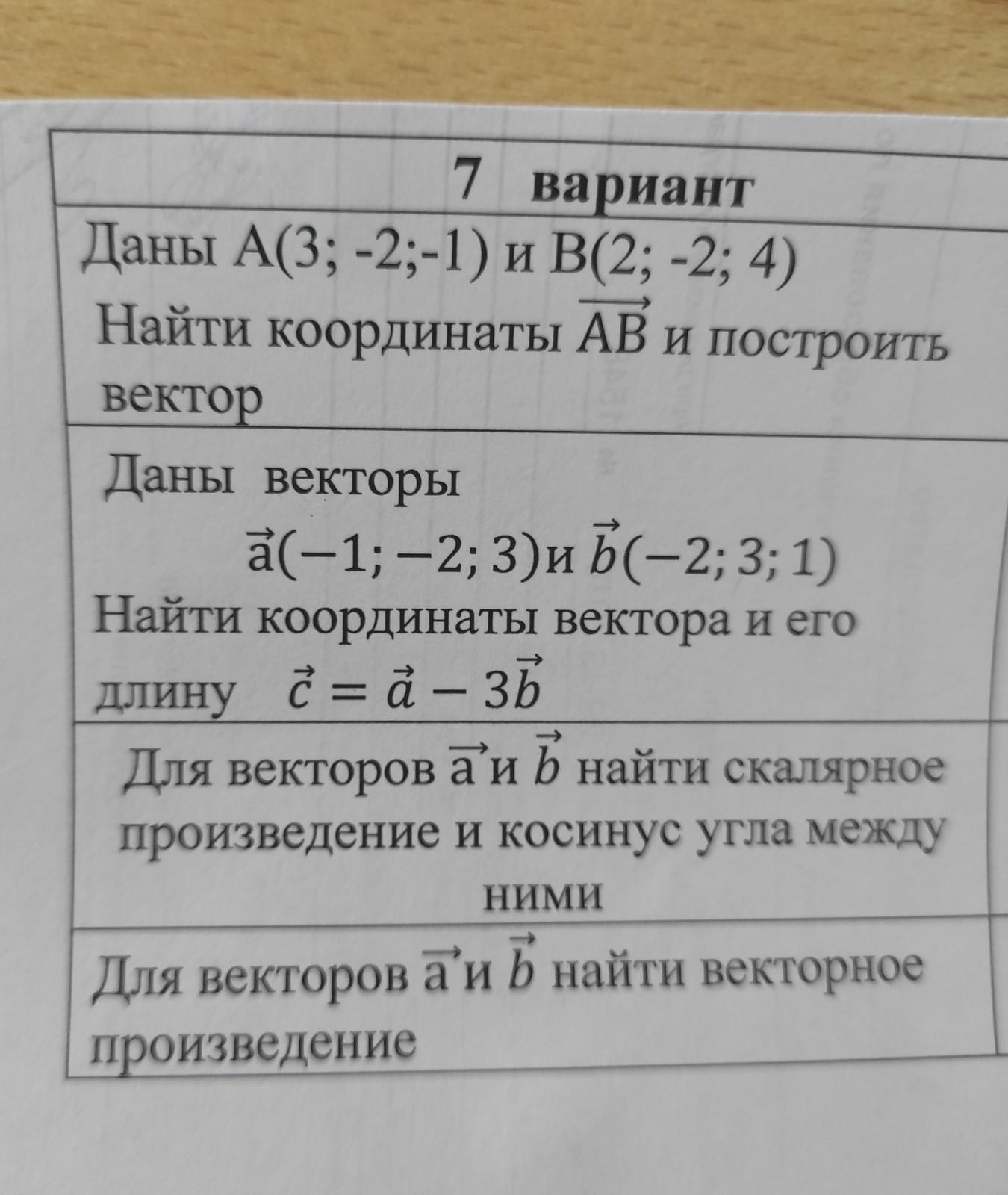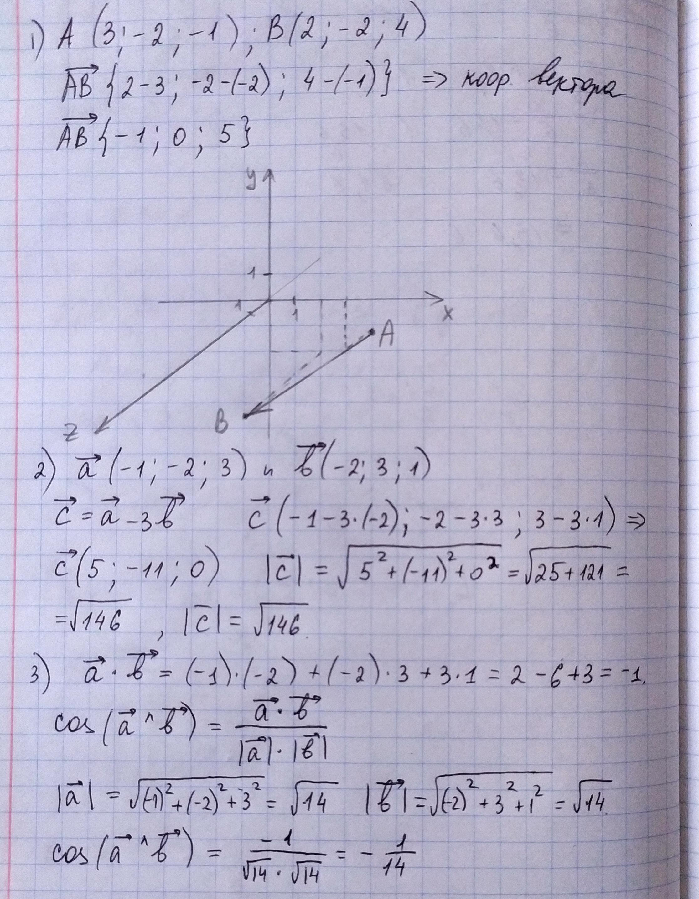 Даны А(3;-2;-1) и В(2; -2; 4) Найти координаты AB и построить вектор Даны векторы a(-1;-2;3), 5(-2;3; 1) Найти координаты вектора и его Длину с = d – зь Для векторов а и b найти скалярное произведение и косинус угла между НИМИ Для векторов а и b найти векторное произведение. В 3 и 4 вопросе , нужно брать данные из первого и второго задания