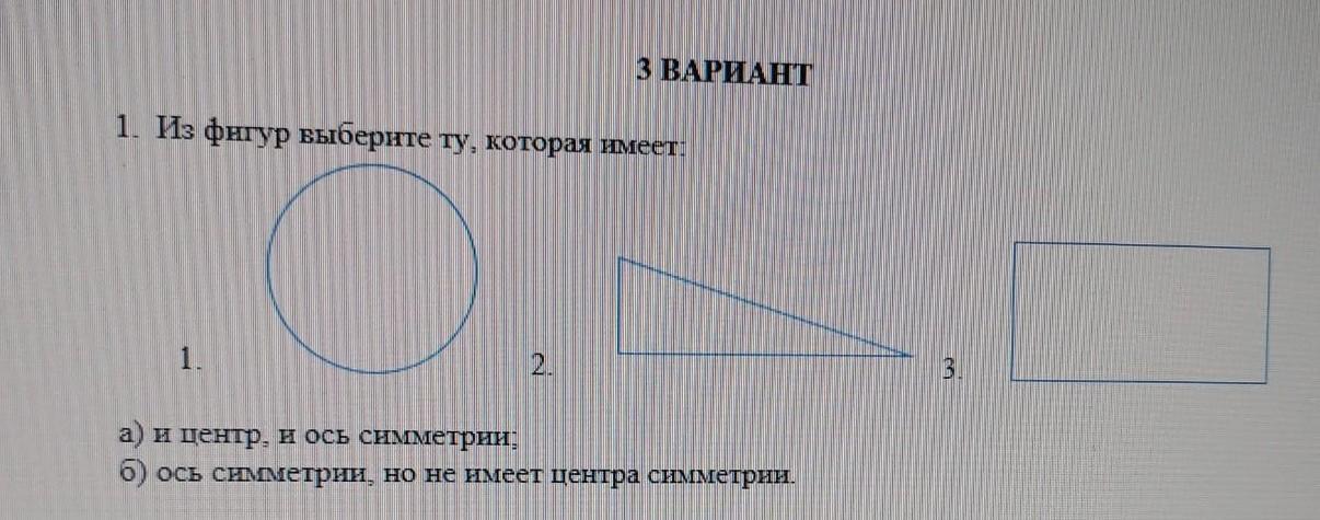 1. Из фигур выберите ту, которая имеет. 1. а) и центр, и ось симметрии: б) ось симметрии, но не имеет центра симметрии.