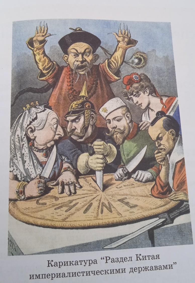 Французская политическая карикатура конца 1890-х. Пирог олицетворяет Китай ("Chine" - фр. Китай), который делят между собой английская королева Виктория, Вильгельм II, император Германский (спорящий с Викторией о куске пирога, вонзив при этом в пирог кинжал в знак своих агрессивных намерений), Николай II, император Российской империи, присматривающий особый кусок, французская Марианна (представленная не принимающей участия в разделении пирога, и приближённой к Николаю II как знак Франко-русского союза) и японский император Мэйдзи, глубоко задумавшийся, какие куски ему взять. Позади них представитель двора Цин, поднявший руки, чтобы остановить их, но безуспешно. Карикатура представляет отношение глав перечисленных империй к Китаю в то десятилетие.
