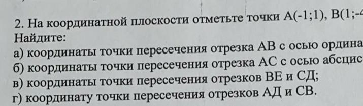 2. На координатной плоскости отметьте точки A(-1;1) , B(1;-4) , C(-3;-2) , H(7;0) , Е (3;-6) Найдите: а) координаты точки пересечения отрезка АВ с осью ординат; б) координаты точки пересечения отрезка АС с осью абсцисс; в) координаты точки пересечения отрезков ВЕ и СД; г) координату точки пересечения отрезков АД и СВ.