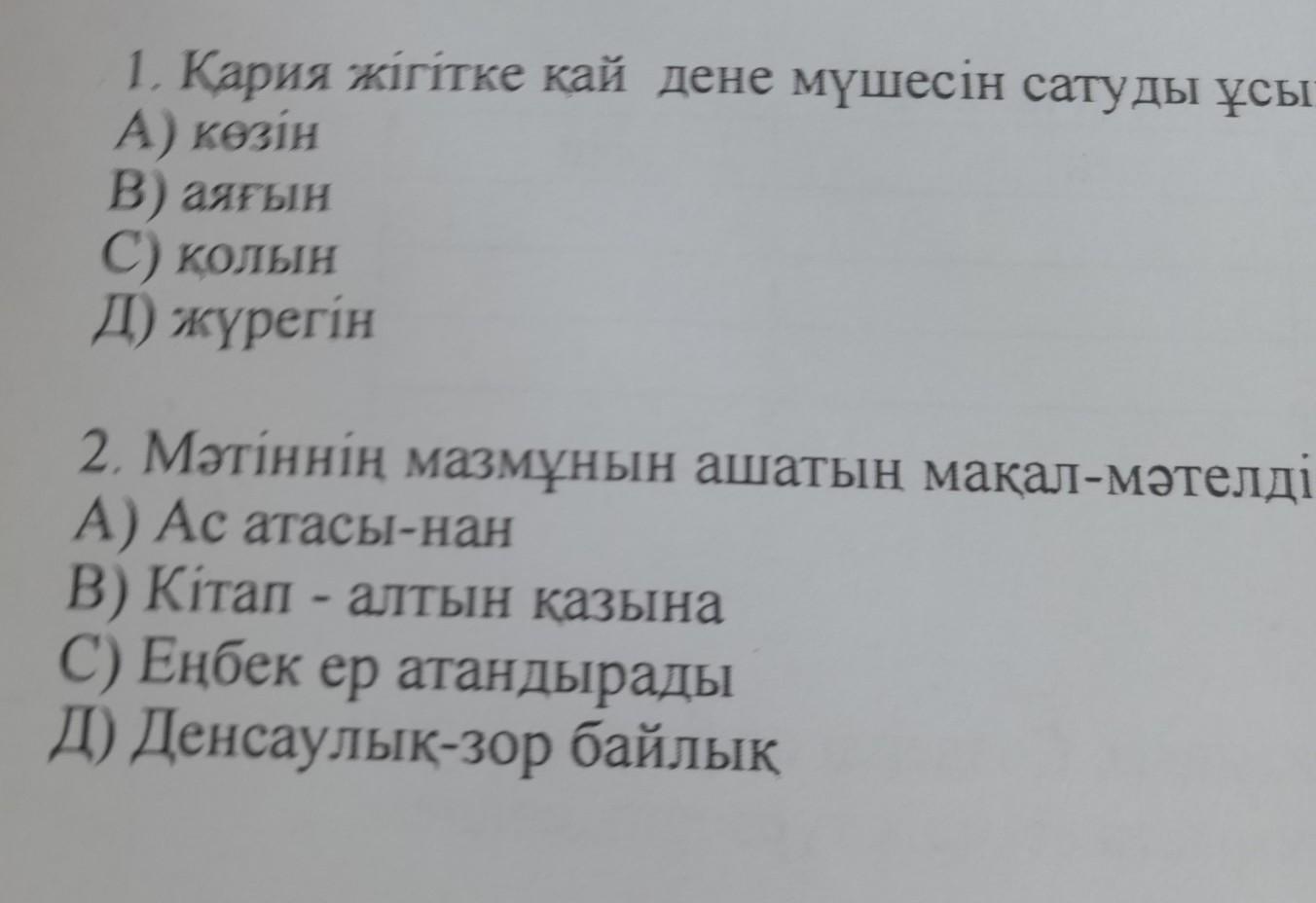 1. Қария жігітке қай дене мүшесін сатуды ұсынады? А) көзін В) аяғын С) қолын Д) жүрегін 2. Мәтіннің мазмұнын ашатын мақал-мәтелді белгілеңіз. А) Ас атасы-нан В) Кітап - алтын қазына C) Еңбек ер атандырады Д) Денсаулық-зор байлық
