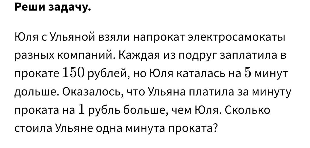 Юля с Ульяной взяли напрокат электросамокаты разных компаний. Каждая из подруг заплатила в прокате 150 рублей, но Юля каталась на 5 минут дольше. Оказалось, что Ульяна платила за минуту уту проката на 1 рубль больше, чем Юля. Сколько стоила Ульяне одна минута проката?