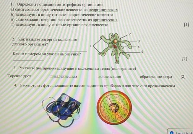 1. Определите описание автотрофных организмов а) сами создают органические вещества нз неорганических б) нспользуют в пишу готовые неорганические вещества в) сами создают неорганические вещества из органических г) нспользуют в пишу готовые органические вещества [1] 2. Как называется орган выделения данного организма? 4. Каким номером он указан на рисунке? [1] 3. Укажите два процесса, идушие с выделением тепла (подчеркните) Горение дров плавлениельда образование ветра [2] конденсация 4. Рассмотрите фото, подпишите название данных приборов и для чего они предназначены
