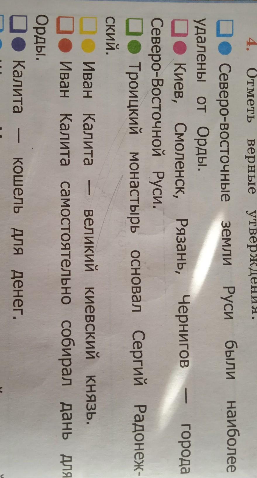 Помогите с домашним заданием по окружающему миру! Отметь верные утверждения. Северо-восточные земли Руси были наиболее удалены от Орды. Oе Киев, Смоленск, Рязань, Чернигов города Северо-Восточной Руси. Оe Троицкий монастырь основал Сергий Радонеж- ский. Иван Калита великий киевский князь. Иван Калита самостоятельно собирал дань для Орды. Калита кошель для денег. Шапка Мономаха великокняжеский головной убор.