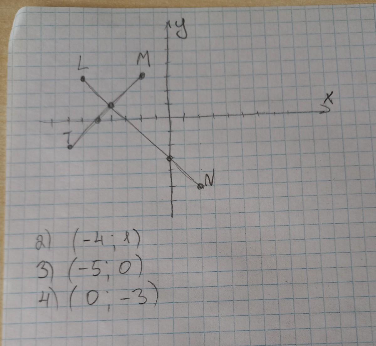 7. Отметьте на координатной плоскости точки L (-6;3), N (2;-5), М (-2;3) и T(-7;-2). 1) Проведите прямые LNи МТ. 2) Найдите координаты точки пересечения прямых LN и МТ. 3) Найдите координаты точки пересечения прямой МТ с осью абсцисс. 4) Найдите координаты точки пересечения прямой LN с осью ординат.