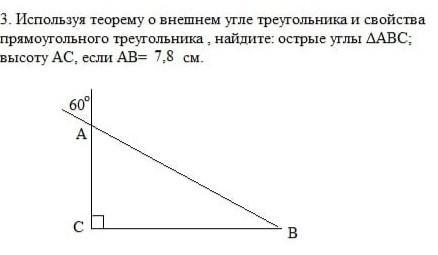 3. Используя теорему о внешнем угле треугольника и свойства прямоугольного треугольника, найдите: острые углы ДАВС, высоту АС, если АВ= 7,8 см.