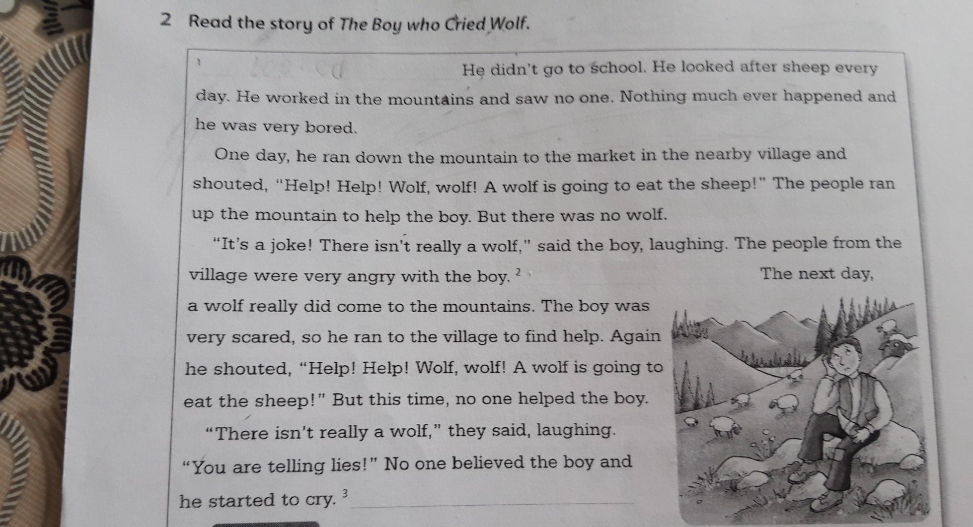 Read the story of The Boy who Cried Wolf. He didn't go to school. He looked after sheep every day. He worked in the mountains and saw no one. Nothing much ever happened and he was very bored One day, he ran down the mountain to the market in the nearby village and shouted, "Help! Help! Wolf, wolf! A wolf is going to eat the sheep!” The people ran up the mountain to help the boy. But there was no wolf. "It's a joke! There isn't really a wolf," said the boy, laughing. The people from the village were very angry with the boy? The next day, a wolf really did come to the mountains. The boy was very scared, so he ran to the village to find help. Again he shouted, "Help! Help! Wolf, wolf! A wolf is going to eat the sheep!" But this time, no one helped the boy. "There isn't really a wolf," they said, laughing "You are telling bes!" No one believed the boy and he started to cry.