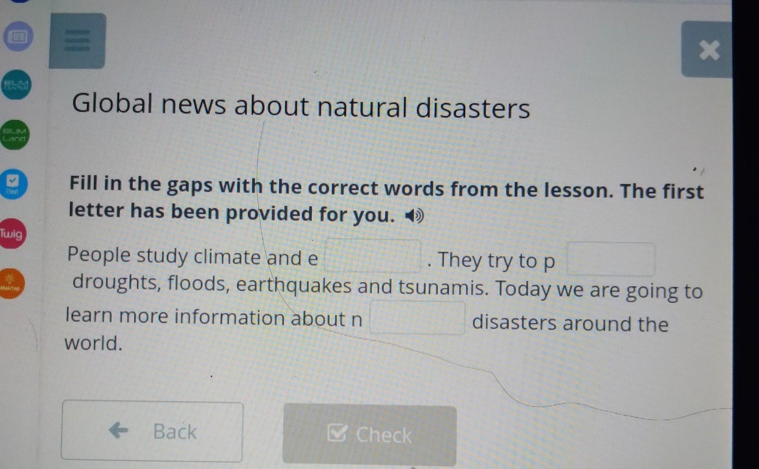 Global news about natural disasters Fill in the gaps with the correct words from the lesson. The first letter has been provided for you. » People study climate and e They try to p droughts, floods, earthquakes and tsunamis. Today we are going to learn more information about n disasters around the world. Back indeck