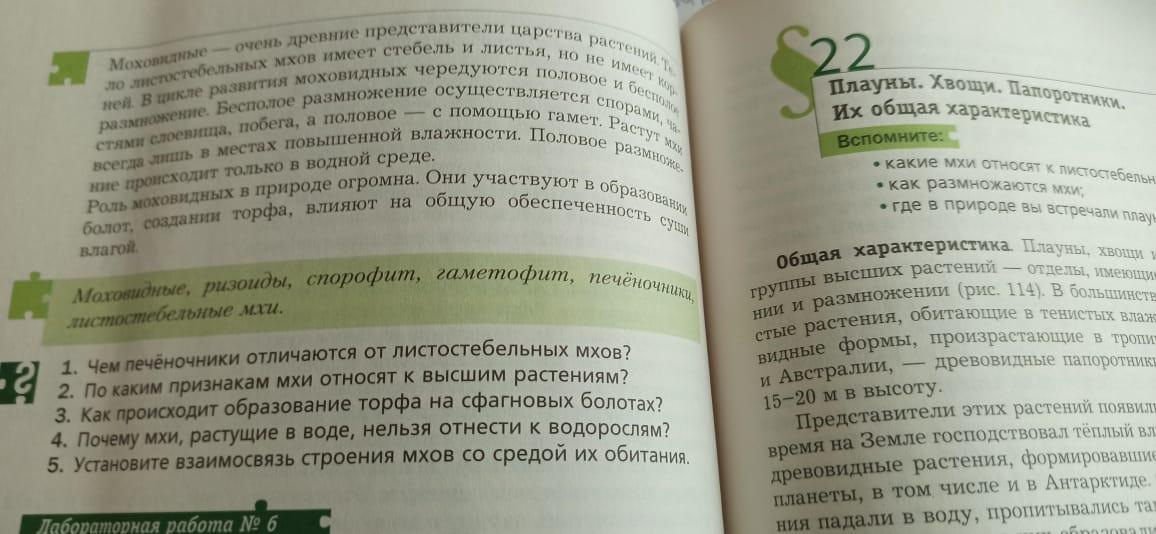 1)У листостебельных мхов, в отличие от печёночников, хорошо видны стебель и мелкие зелёные листья, т. е. имеются побеги. Есть ризоиды, которые закрепляют растения и поглощают воду из почвы.