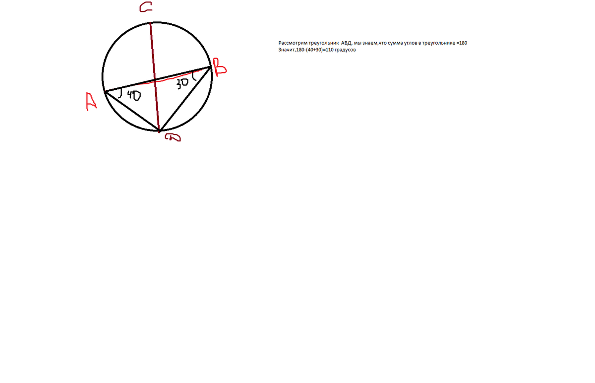 хорды окружности AB и CD пересекаются между собой. Угол BAD равен 40, угол ABD -30. Найти угол ADB