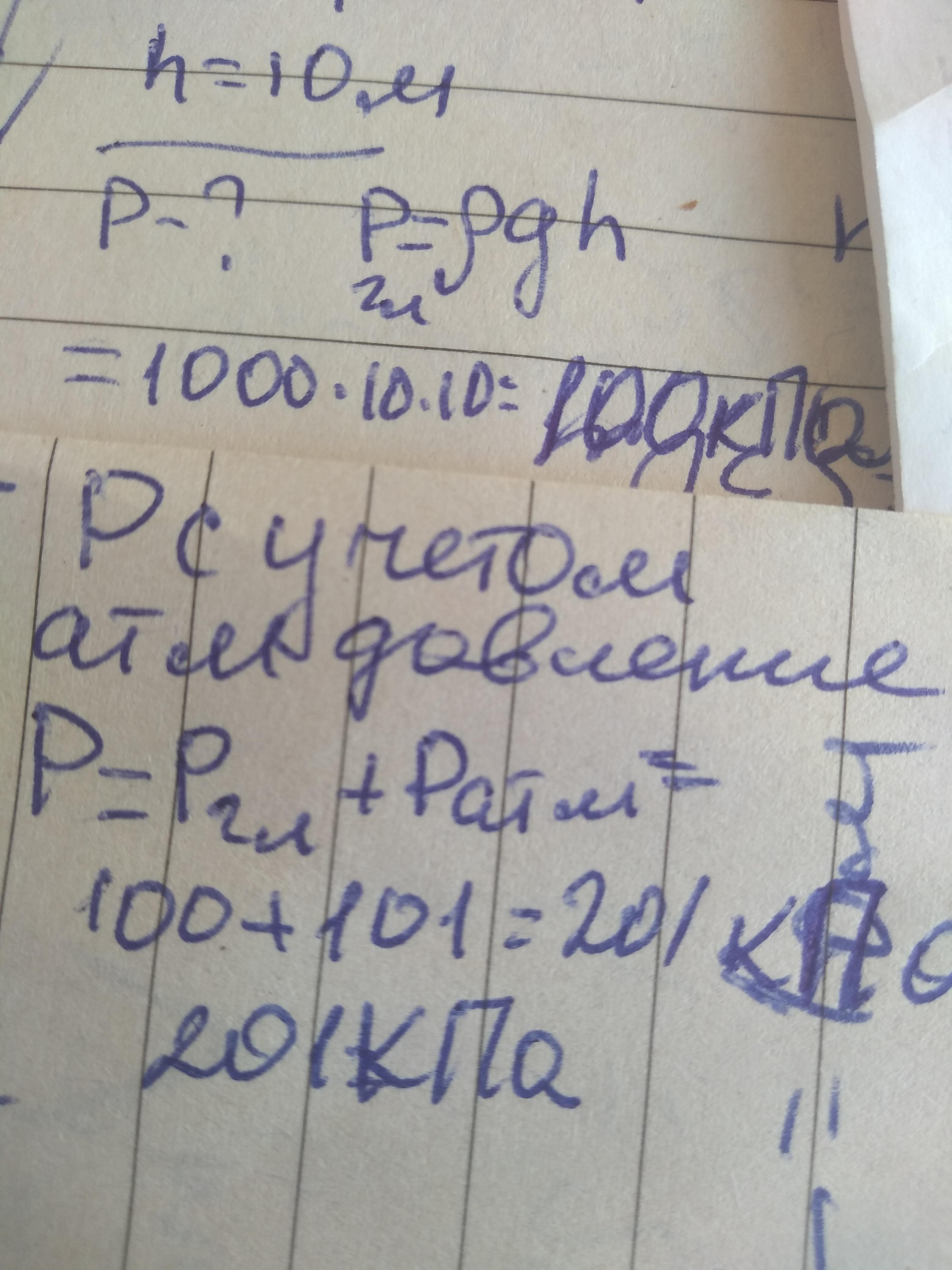 2. Чему равно гидростатическое давление 10 м? Чему равно давление на этой глубине с учетом давления воздуха над поверхностью воды?