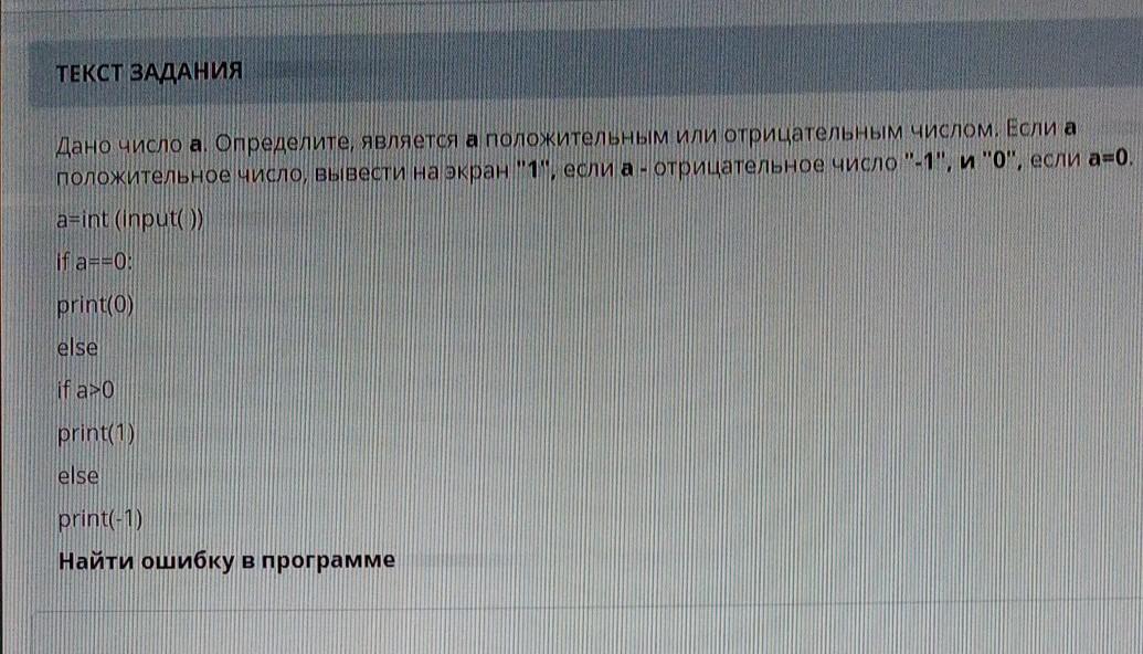 Дано число а. Определите, является а положительным или отрицательным числом. Если а положительное число, вывести на экран "1", если а - отрицательное число "-1", и "о", если a=0. a=int (input) if a==0: print(O) else if a>0 print(1) else print(-1) Найти ошибку в программе