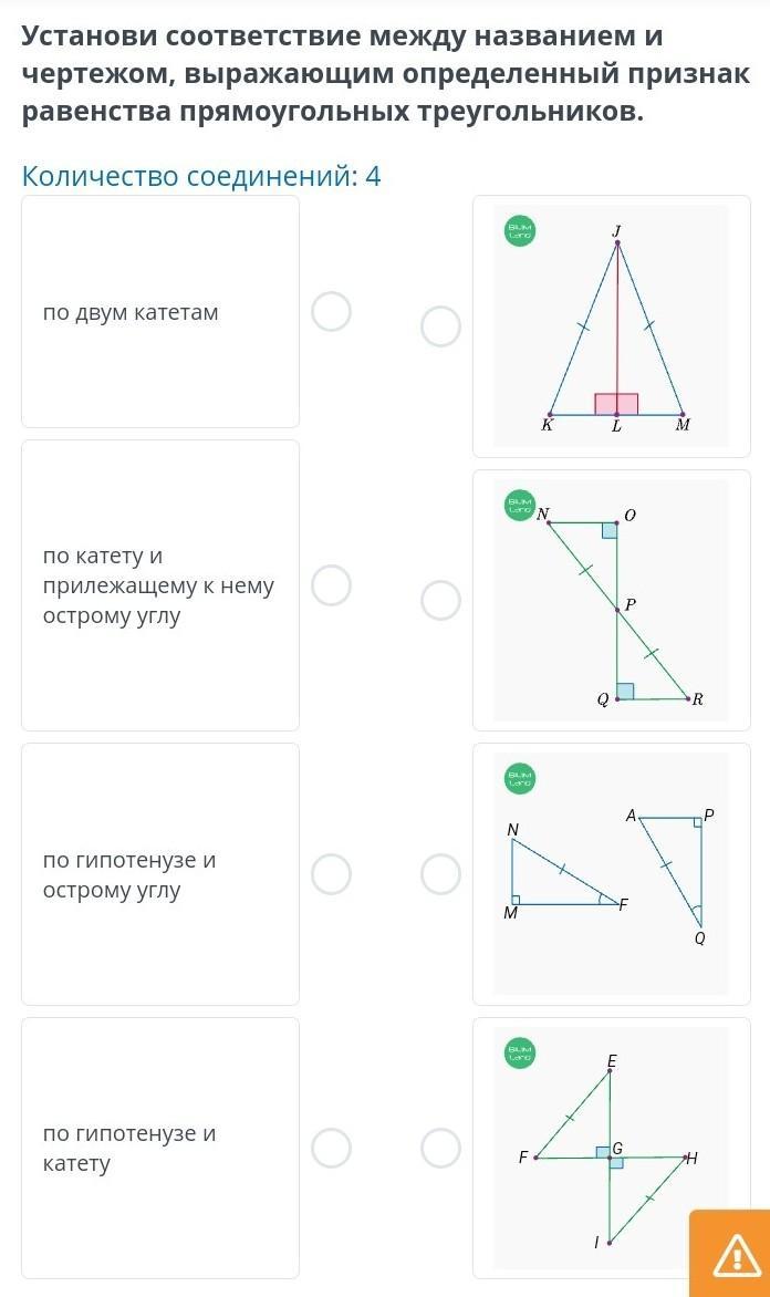 Признаки равенства прямоугольных треугольников. Свойства прямоугольного треугольника. Урок 2 Установи соответствие между названием и чертежом, выражающим определенный признак равенства прямоугольных треугольников. Количество соединений: 4 по двум катетам по катету и прилежащему к нему острому углу по гипотенузе и острому углу по гипотенузе и катету     Назад Проверить