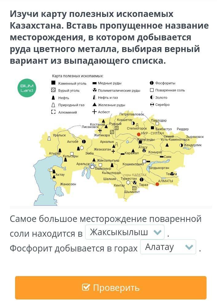 Самое большое месторождение поваренной соли находится в . Фосфорит добывается в горах . Назад Проверить