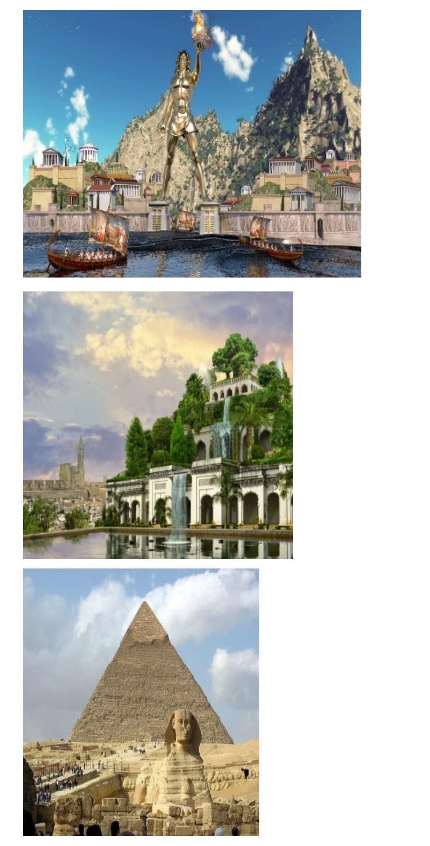 2)Висячие сады Семирамиды (Чудо Древнего мира) — одно из Семи чудес античного мира, которое представляло собой инженерное сооружение в Вавилоне с каскадом многоуровневых садов, где росли многочисленные породы деревьев, кустарников и виноградных лоз, производившее впечатление большой зелёной горы.