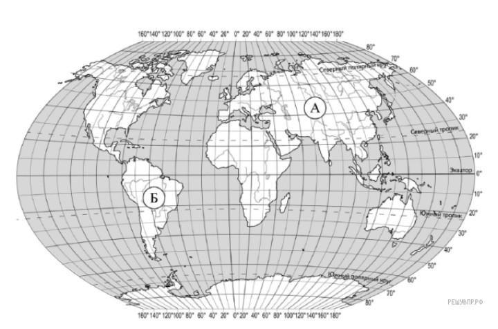 Рассмотрите карту мира. На ней буквами А и Б отмечены два материка. Запиши название каждого материка