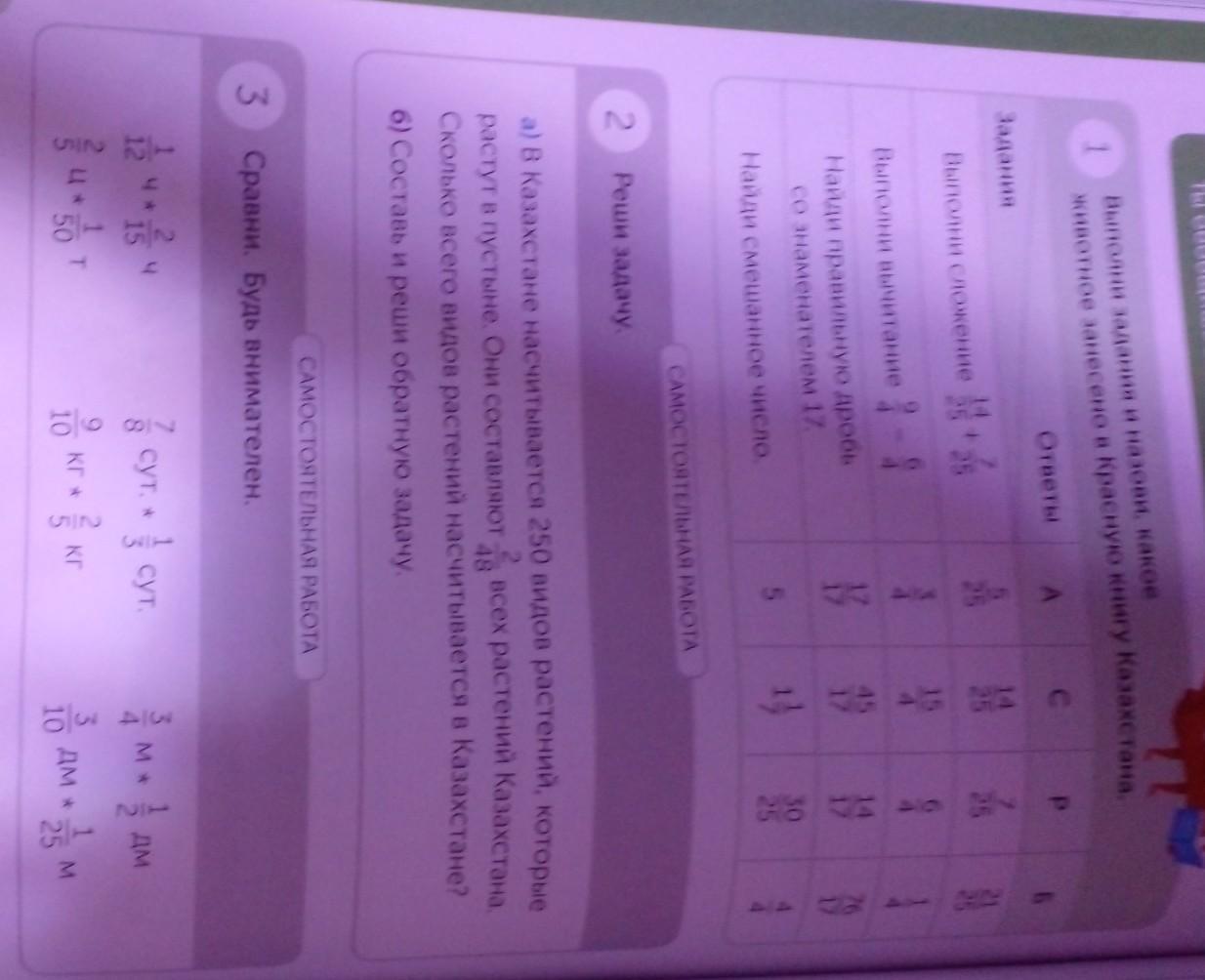 1 Выполни задания и назови, какое животное занесено в Красную книгу Казахстана. Ответы A С P Б Ол Задания 14 7 Выполни сложение + 25 25 14 25 2 25 21 25 Alm | 9 Выполни вычитание 4 6 4 EN AIG Glor 15 4 1 4 Nю оje — 80 14 Найди правильную дробь со знаменателем 17. 17 17 45 17 76 1 17 1 15 11 30 Найди смешанное число Ол 5 4. и 2 и 3 задание