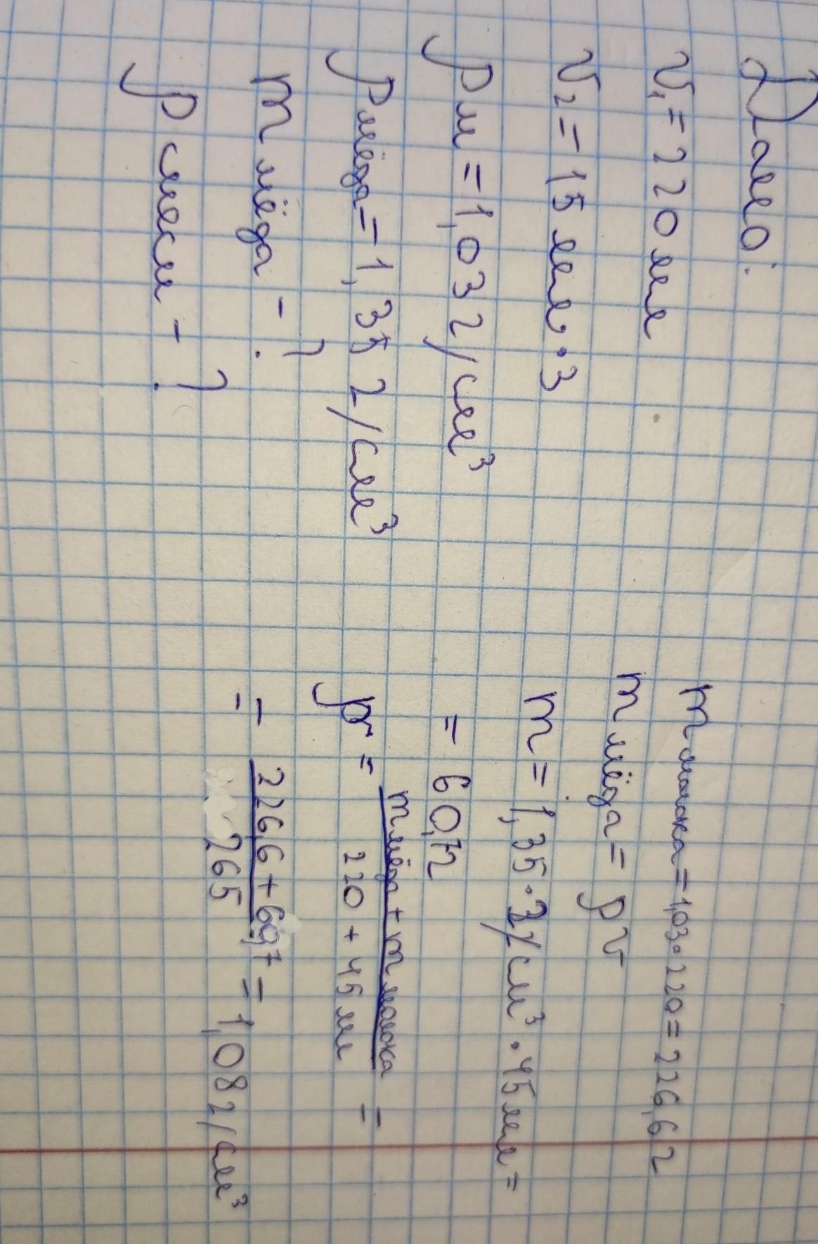 Мама сделала Никите смесь из молока и мёда. Она взяла 220 мл тёплого молока и добавила туда 3 столовые ложки мёда. В одну столовую 3 ложку вмещается 15 мл. Плотность молока 1, 03r / C * M ^ 3 , плотность мёда 1, 35r / C * M ^ 3 . 1) Определи массу мёда, которую добавили к молоку. 2) Определи плотность полученной смеси, считая, что мёд при добавлении в молоко сохраняет свой объём. (Вычисления и ответы округляй до сотых долей.) Ответы: 1) масса мёда 2) плотность смеси r / C * M ^ 3 .