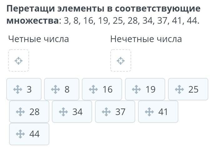 Перетащи элементы в соответствующие множества: 3, 8, 16, 19, 25, 28, 34, 37, 41, 44. Четные числа Нечетные числа