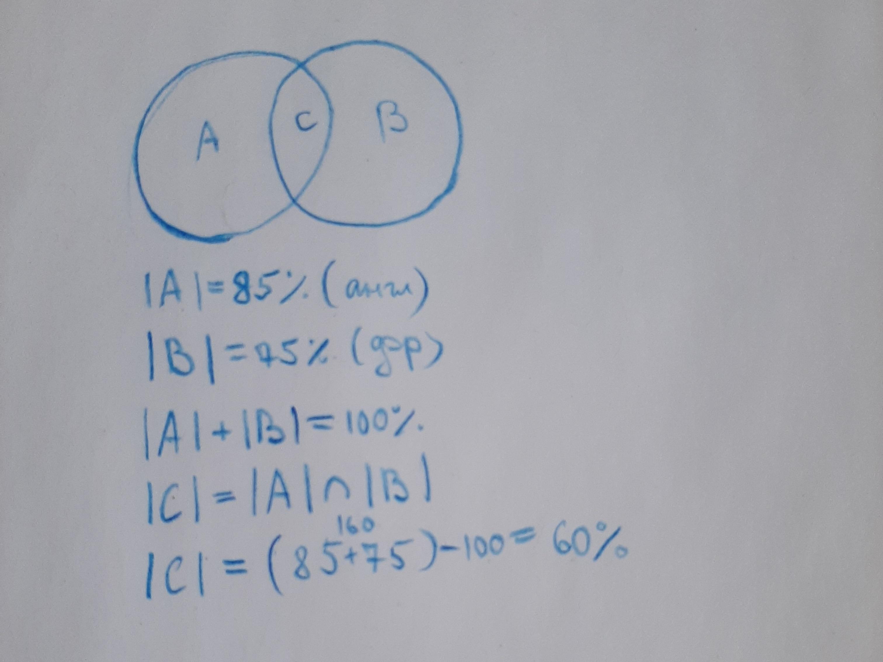 По статистике в Канаде 85% населения говорит только по-английски, 75% – только по-французски. Сколько процентов населения говорит на обоих языках?