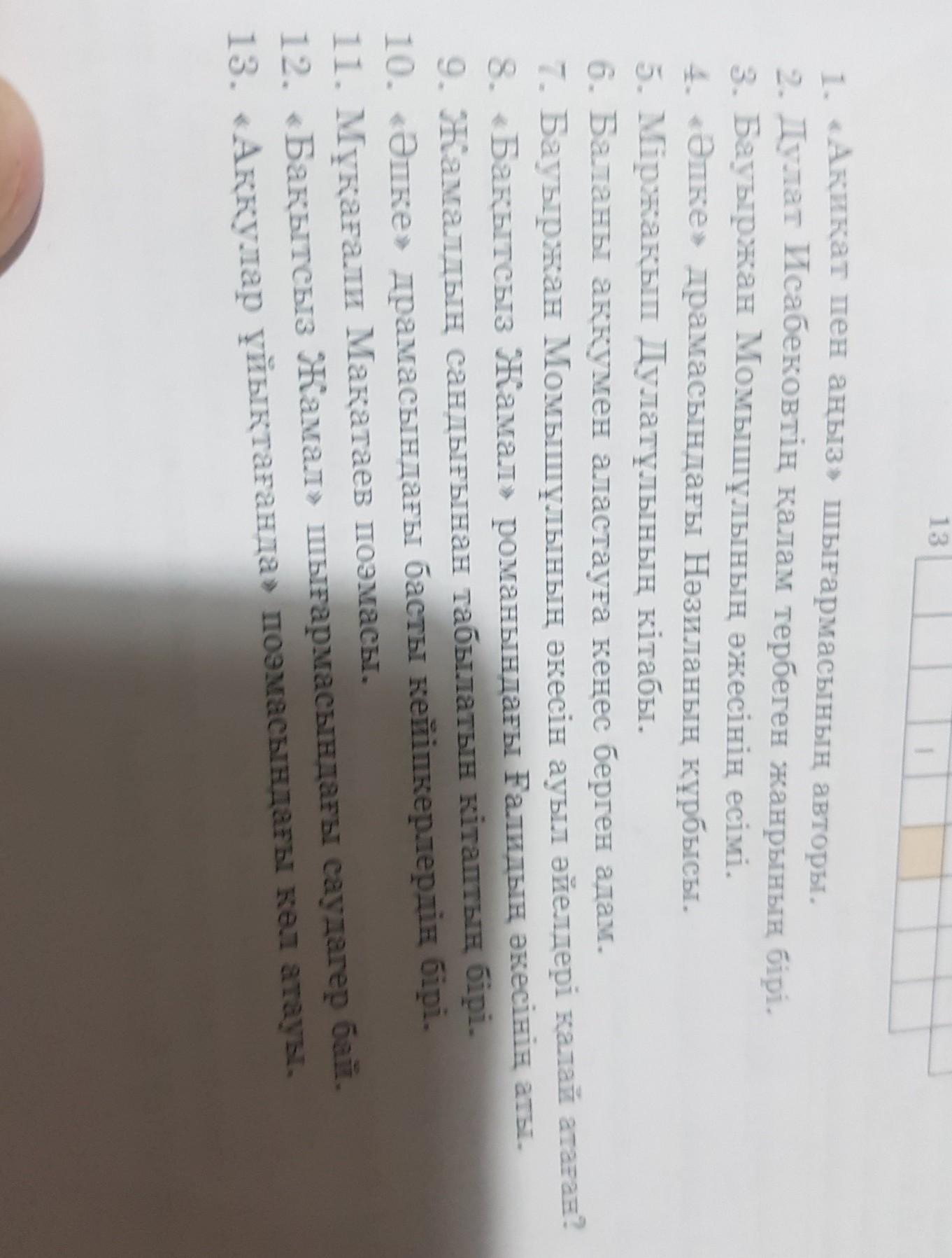 1. «Ақиқат пен аңыз» шығармасының авторы. 2. Дулат Исабековтің қалам тербеген жанрының бірі. 3. Бауыржан Момышұлының әжесінің есімі. 4. «Әпке» драмасындағы Нәзиланың құрбысы. 5. Міржақып Дулатұлының кітабы. 6. Баланы аққумен аластауға кеңес берген адам. 7. Бауыржан Момышұлының әкесін ауыл әйелдері қалай атаған? 8. «Бақытсыз Жамал» романындағы Ғалидың әкесінің аты. 9. Жамалдың сандығынан табылатын кітаптың бірі. 10. «Әпке» драмасындағы басты кейіпкерлердің бірі. 11. Мұқағали Мақатаев поэмасы. 12. «Бақытсыз Жамал» шығармасындағы саудагер бай. 13. «Аққулар ұйықтағанда» поэмасындағы көл атауы.